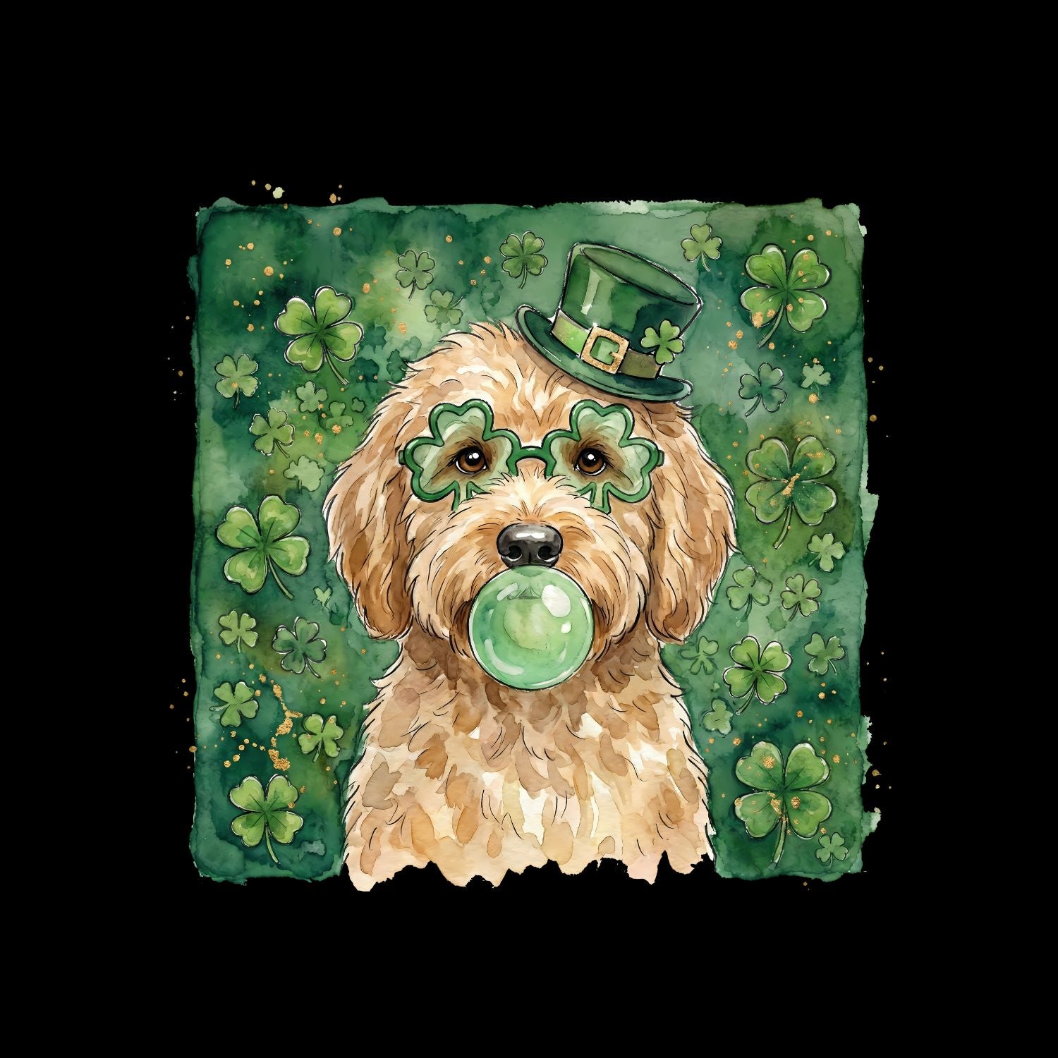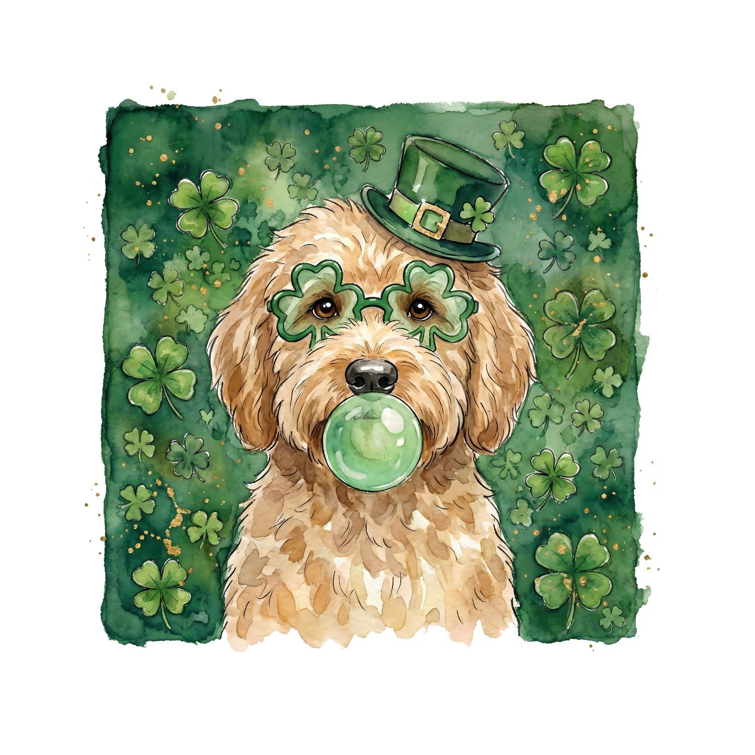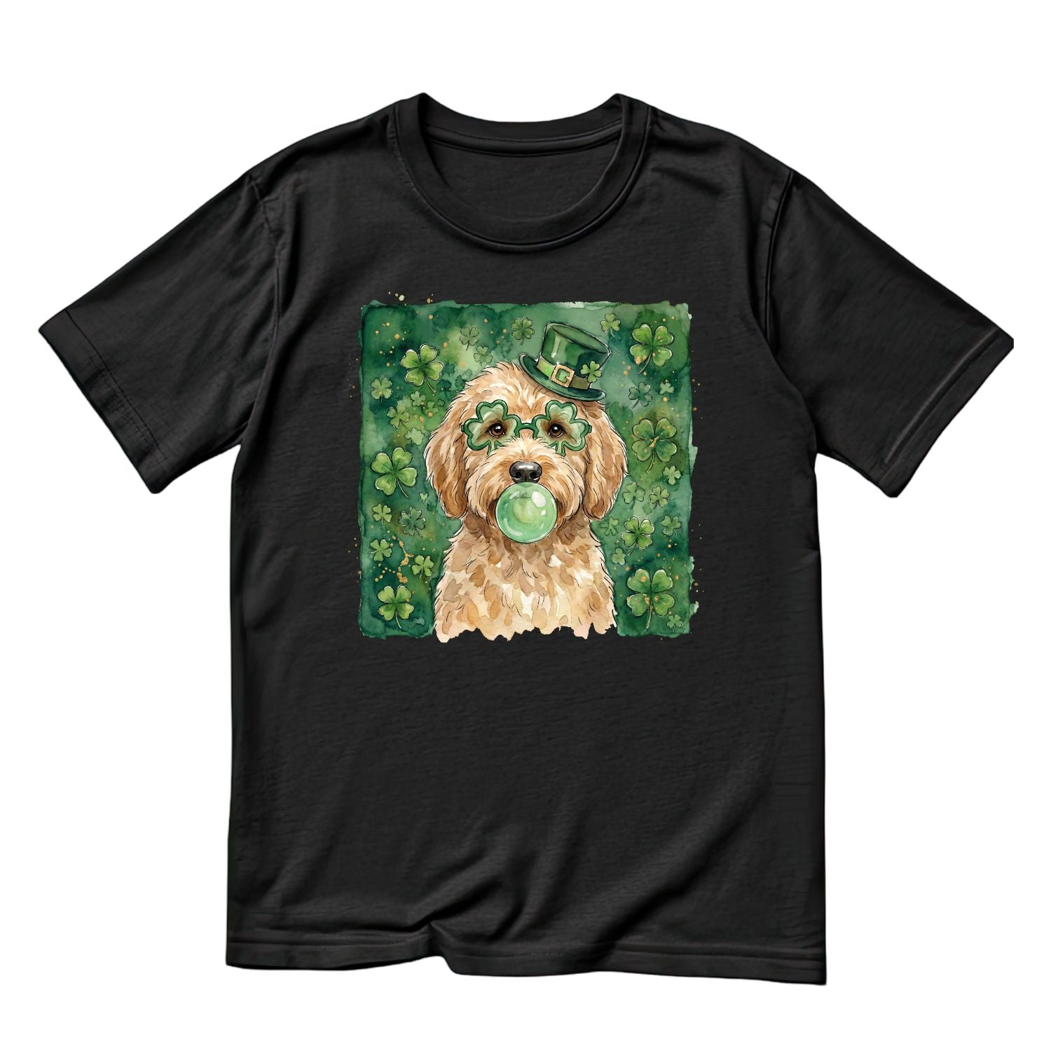 Dog Watercolour St. Patrick’s Day Wearing Top Hat & Glasses Blowing Gum Bubble T-shirt | St Patrick’s Day T-shirt | Shamrock