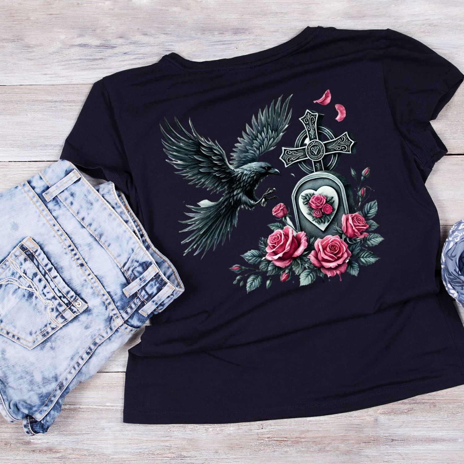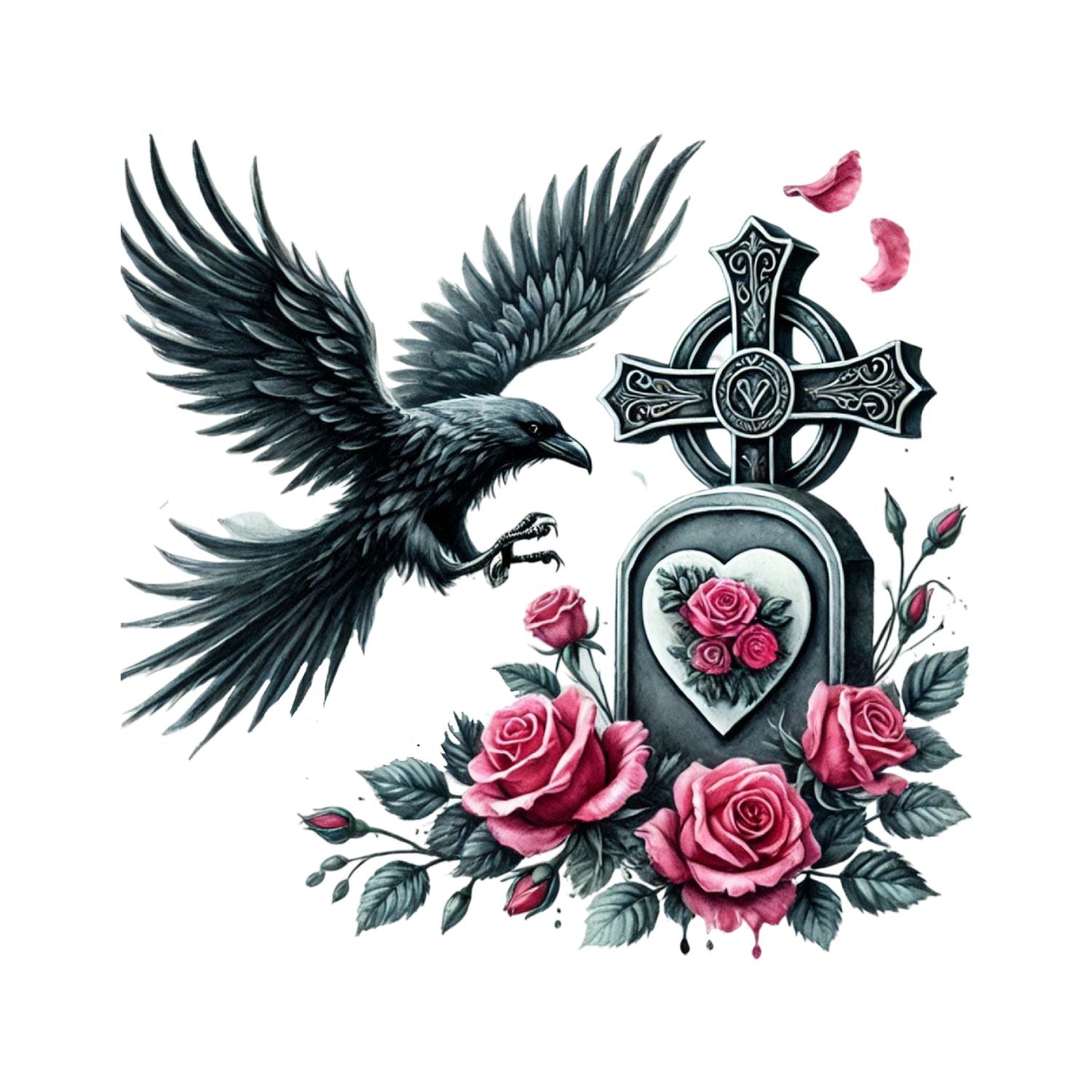 Crow Marks The Grave T-Shirt | Gothic | Tombstone Cross Pink & Black Roses | Dark Valentine