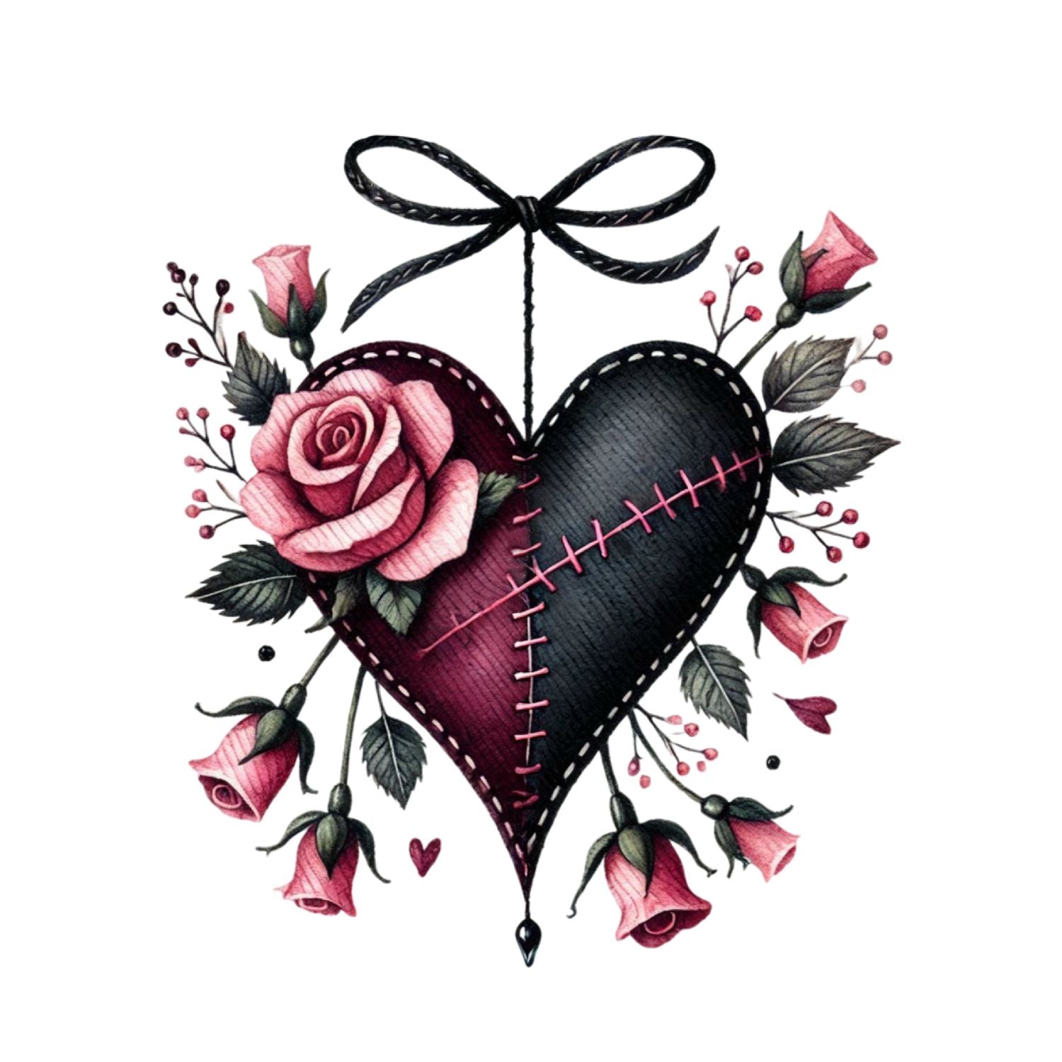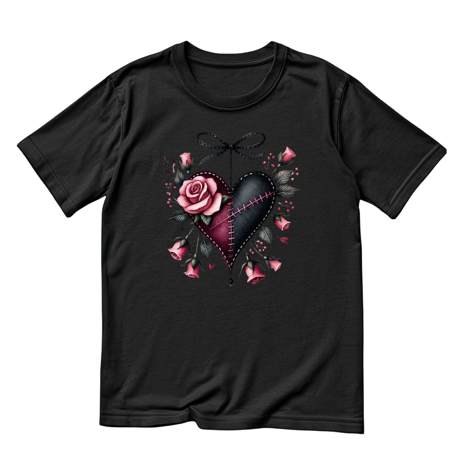 Stitched Heart Black Bow T-Shirt | Gothic | Rose Bouquet Pink & Black Roses| Dark Valentine